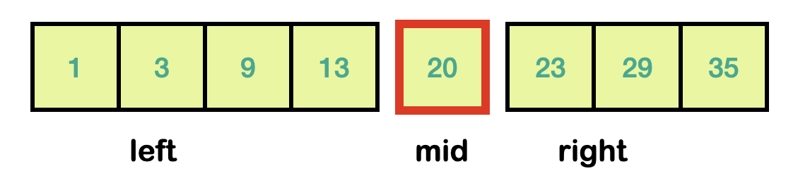 만약 mid 보다 35가 더 작으면 왼쪽에 나눠진 데이터를 기준으로 반복했을 것이고,