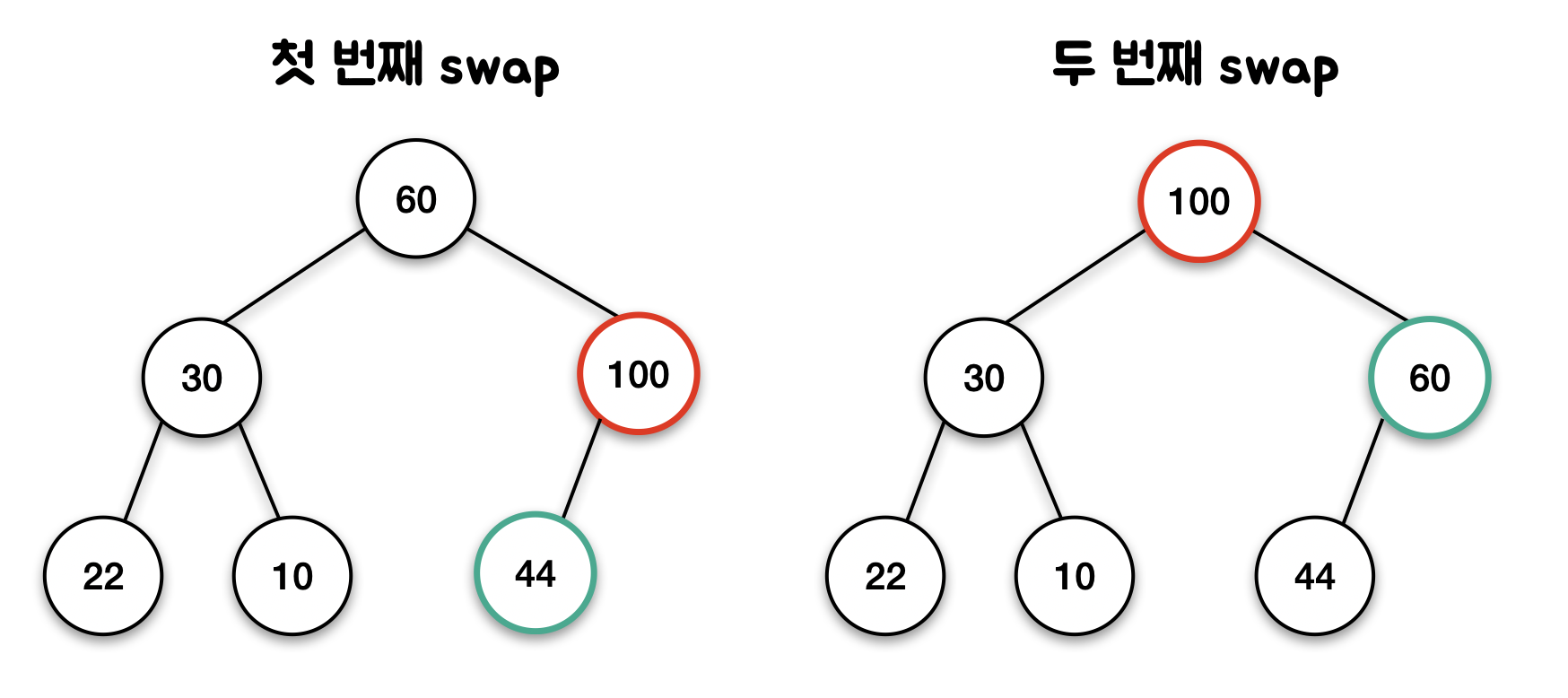 자식 노드 중 큰 값을 가진 노드와 swap 해준다 (반복 작업)