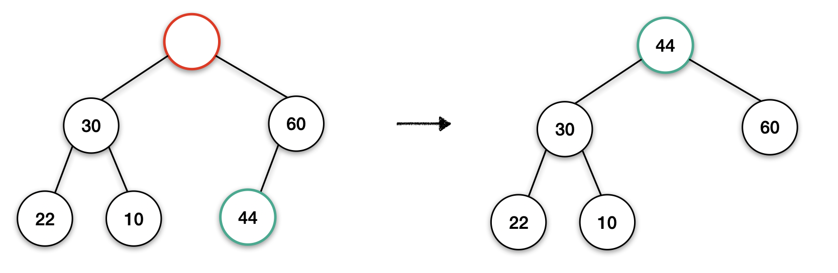 ② 가장 마지막에 추가된 노드(배열 마지막 요소)를 Root Node로 이동한다
