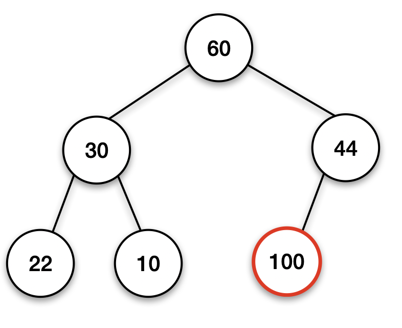 만약 이런 최대 힙에 100이란 데이터를 삽입 한다면!!!
