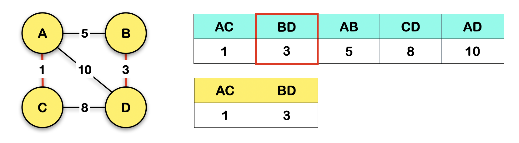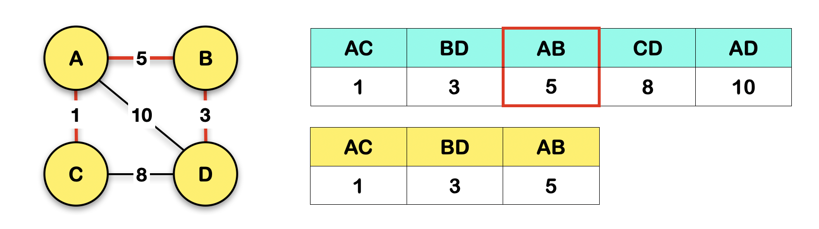 여기서 종료하면 되는 것이고, 선택된 AC, BD, AB가 최소 신장 트리의 간선의 모음임!!!
