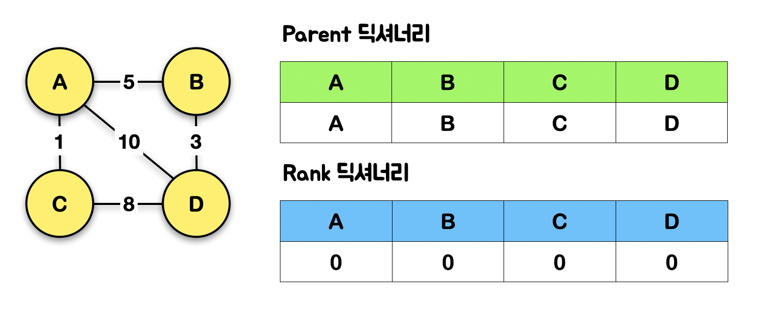 또한 결국 {A, B, C, D} 라는 모든 노드를 포함한 서로소 집합이 됨!!!