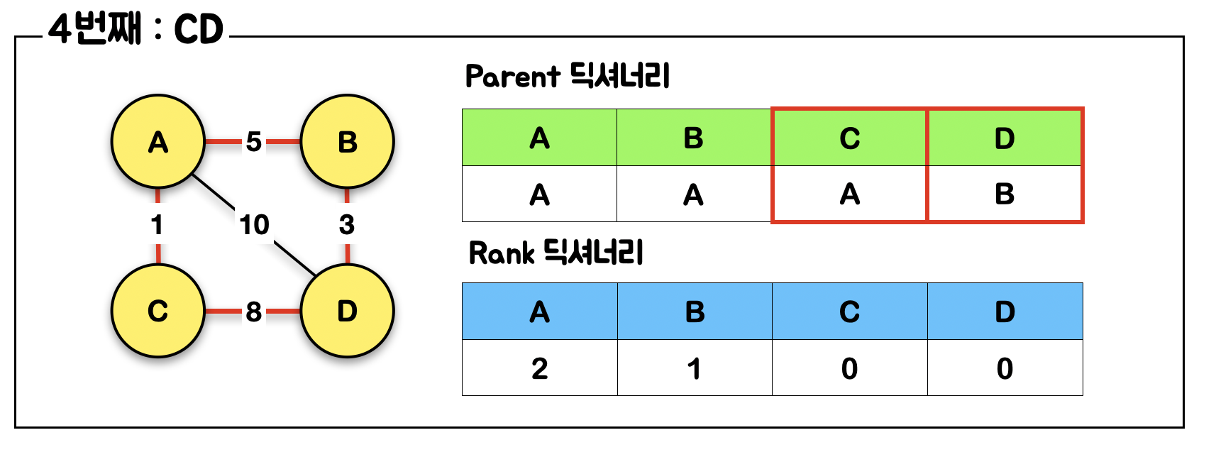 C와 D의 Parent 값이 다른데...!??????? 그럼 union 해야하고..