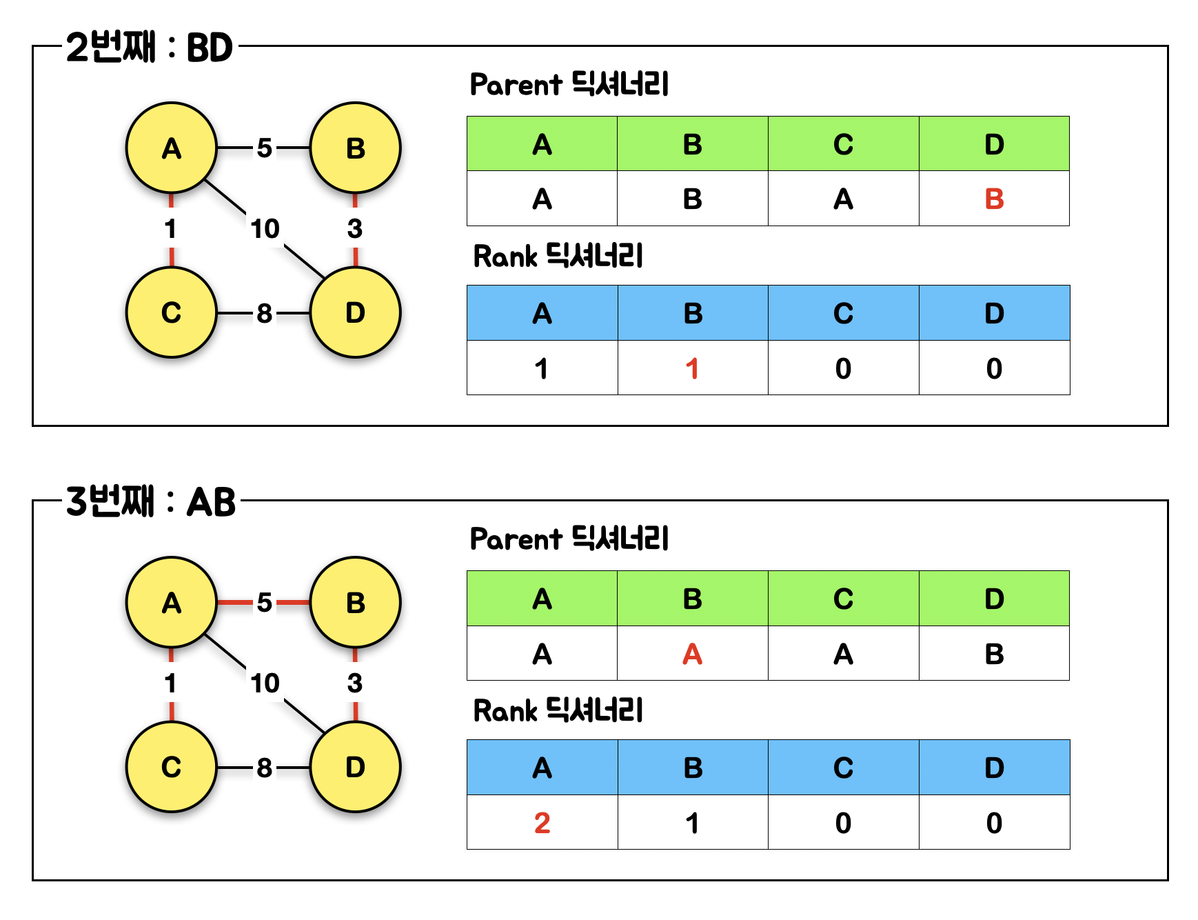이런 식으로 두번 째&세번 째 간선인 BD, AB에 대해서도 Union-Find 작업을 해주고 나면,