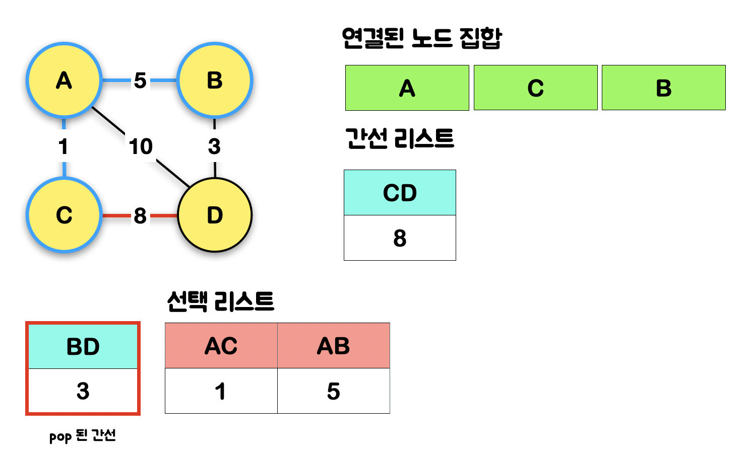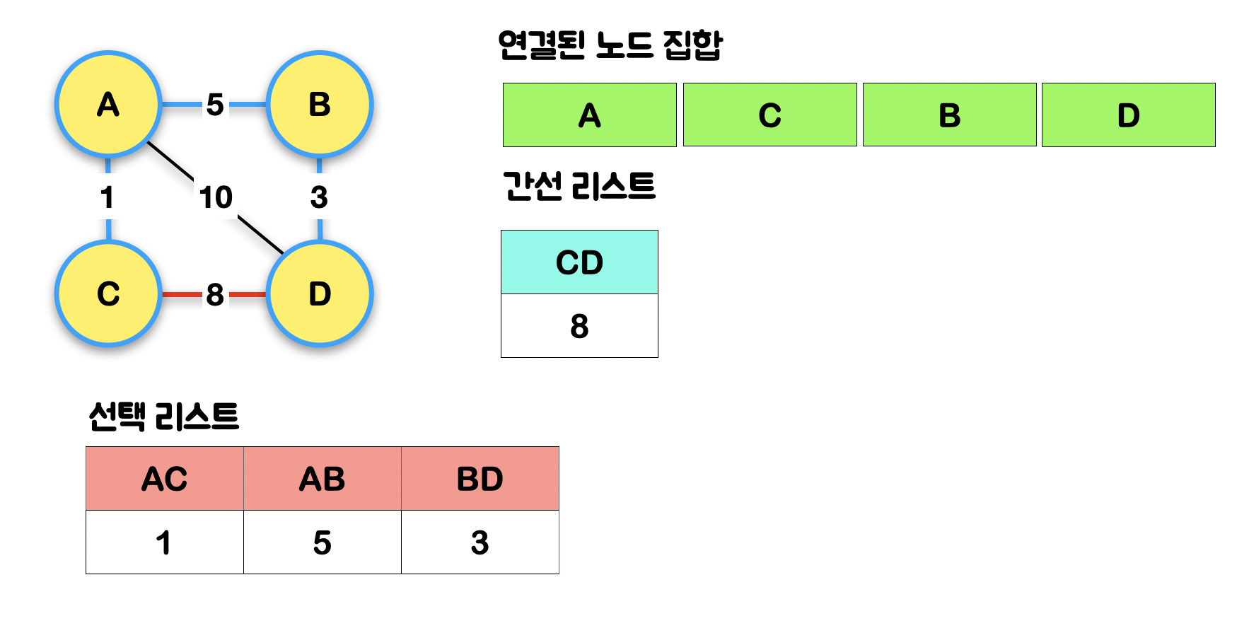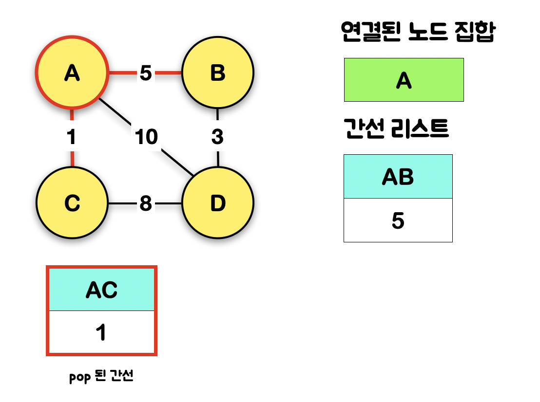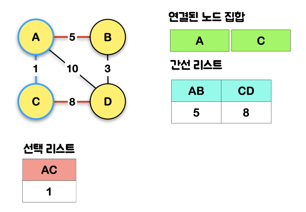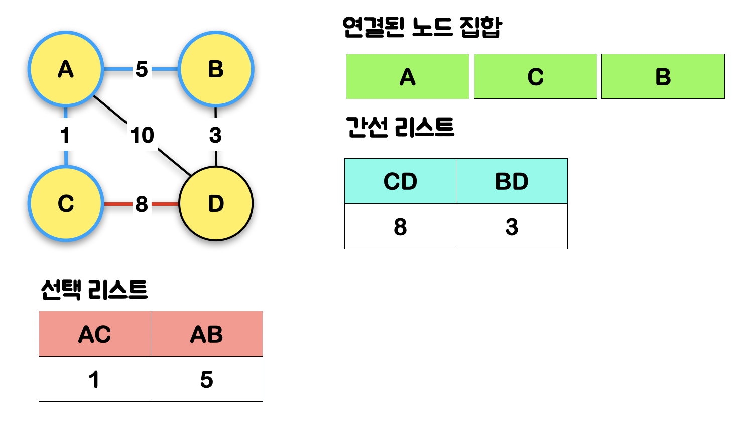 1-4. 만약 해당 간선(AC)의 도착지(C)가 "연결된 노드 집합"에 있다면 사이클이 발생한단 것으로 스킵하기 때문에 "간선 리스트"에서 다시 가장 작은 간선을 꺼내오고, 만약 도착지(C)가 "연결된 노드 집합"에 없다면 해당 간선(AC)을 "선택 리스트"에 넣고, 도착지(C)도 "연결된 노드 집합"에 넣고, 도착지(C)와 연결된 간선을 "간선 리스트"에 삽입한다