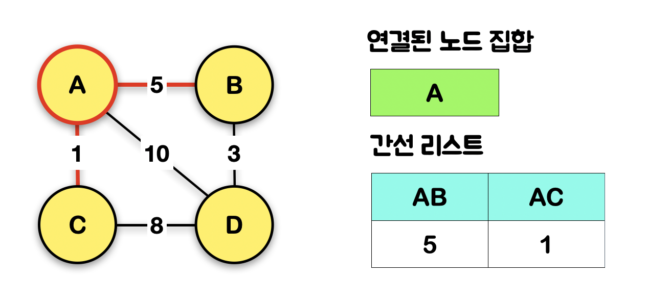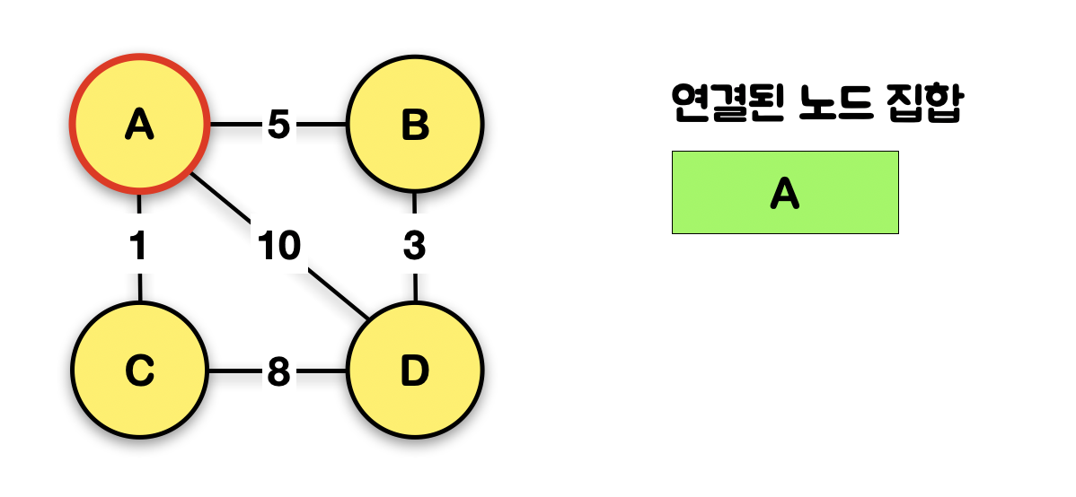 1-1. 시작 노드(A)를 정하고, 이를 "연결된 노드 집합"에 삽입한다