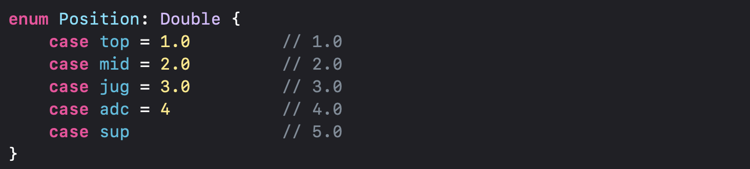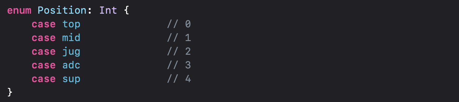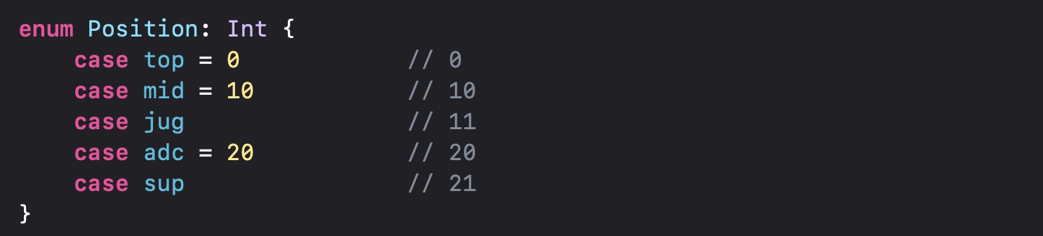 이렇게 Int라는 타입을 enum 선언 시 이름 옆에 명시해주면,