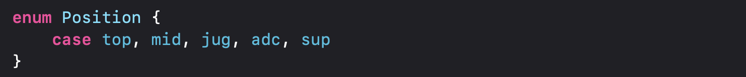 그냥 다음과 같이 열거형 이름만 쓰고 선언해주면, 원시값이 없는 열거형임!
