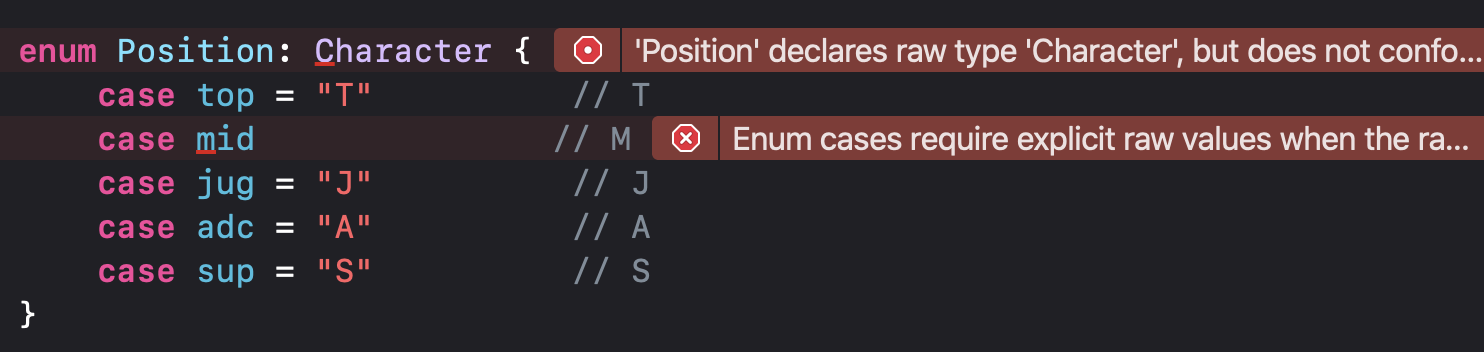 이전 case의 Raw Value가 "T"로 정수형이 아니라 + 1 못해!!! 하고 에러 뱉는 것임! :)