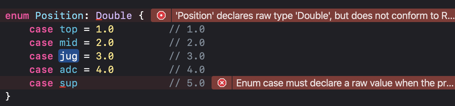 Raw Value를 생략하고 싶다면, 바로 이전 case의 Raw Value를 정수 값으로 해주어야 함!!!