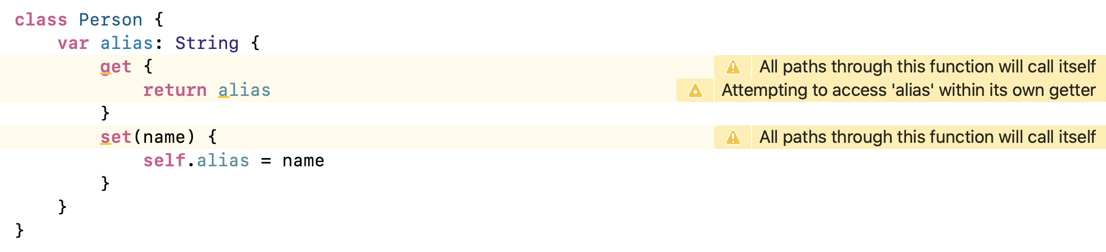 근데 위 코드는 get, set에서 alias란 "연산 프로퍼티"를 지지고 볶고 있음