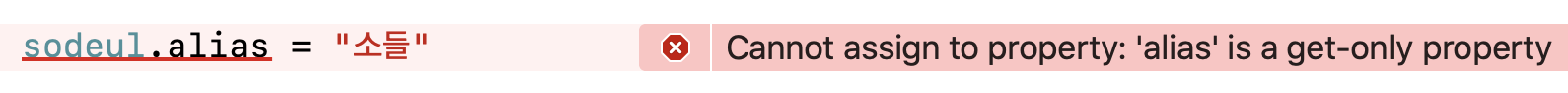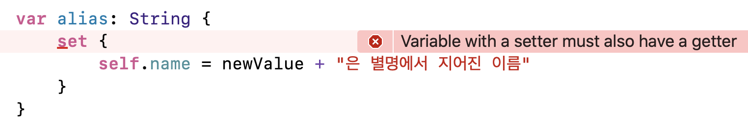 당연히 alias는 set이 없기 때문에 다음과 같이 연산 프로퍼티인 alias에 값을 넣으려고 하면,