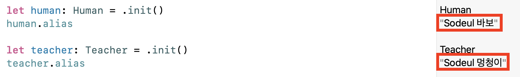 확인해보면, Human의 alias와 Teacher의 오버라이딩 된 alias를 접근할 때
