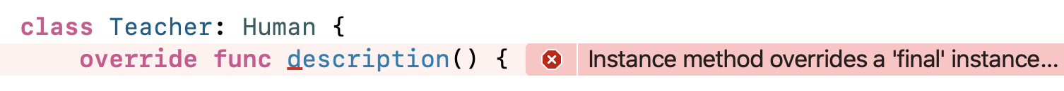 func description() { // Overriding declaration requires an 'override' keyword, Insert 'override '