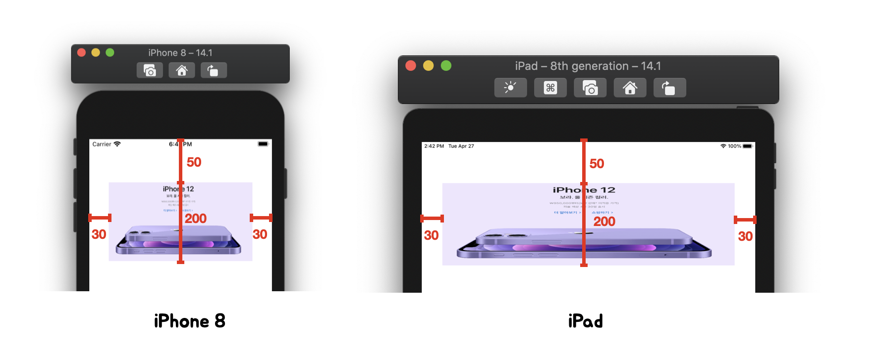 이 경우엔 Leading / Trailing Cosntraints에 의해 해상도 별로 width가 자동으로 지정 됨 :)