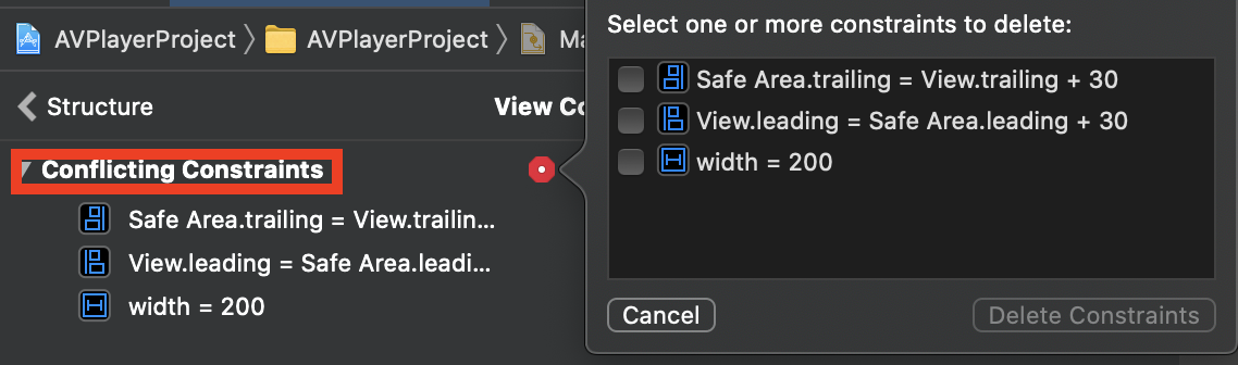 Constraints가 충돌했다며, leading / trailing / width 중 하나를 지우라는 에러가 뜸!