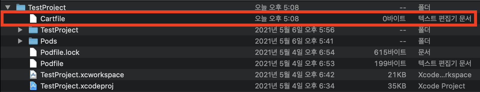 아, 성공하면 여러 파일이 생기지만 그중 Cartfile.resolved란 파일이 생기는데,