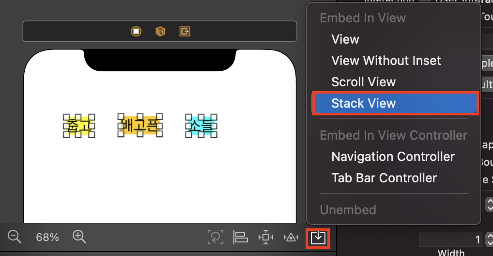 스택뷰에 넣고 싶은 뷰들을 모두 클릭한 상태로(Command + 클릭)