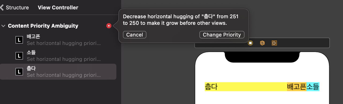 이때 어떤 Label이 Intrinsic content size를 지키지 못하고 늘어날래??