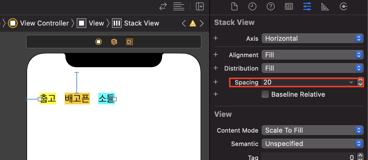 Spacing은 스택뷰 안의 뷰 간 간격을 설정할 때 사용함