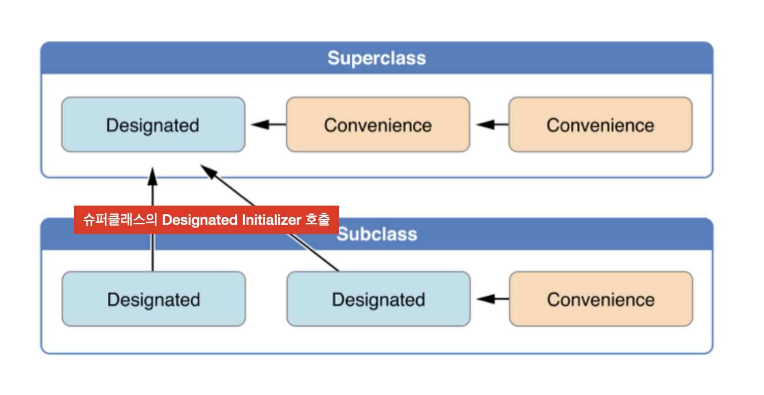 Convenience Initializer는 반드시 동일한 계층(클래스)의 initailizer를 호출해야 합니다