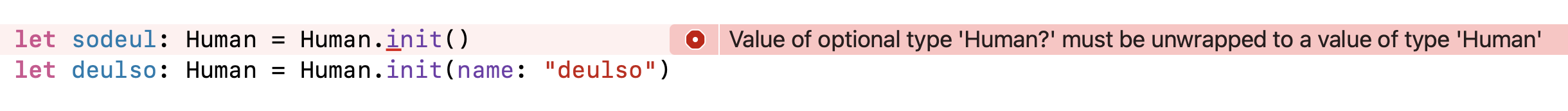 sodeul의 타입, 즉 옵셔널 타입이 아닌 Human 타입에 대입할 시 초기화 성공/실패와 상관 없이 무조건 위처럼 에러가 남