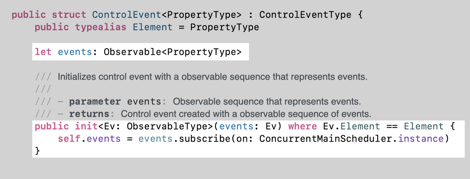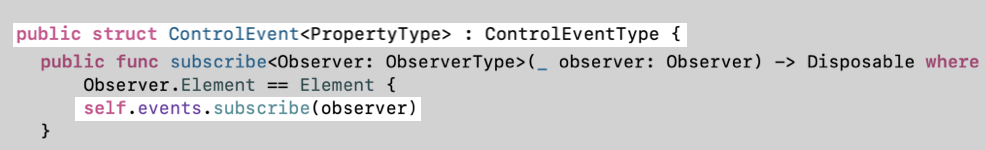 ControlEvent 구조체는 내부 이벤트 Observable의 subscribe(_:)를 사용할 수 있도록