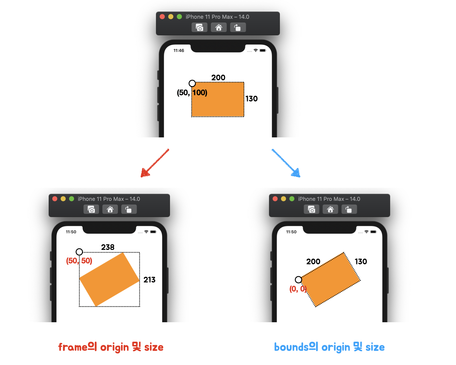 | 사용 용도 | View의 위치와 크기를 나타낼 때 | - View를 회전한 후 View의 실제 크기를 알고 싶을 때 - View 내부에 그림을 그릴 때 (drawRect) - ScrollView에서 스크롤링 할 때 |
