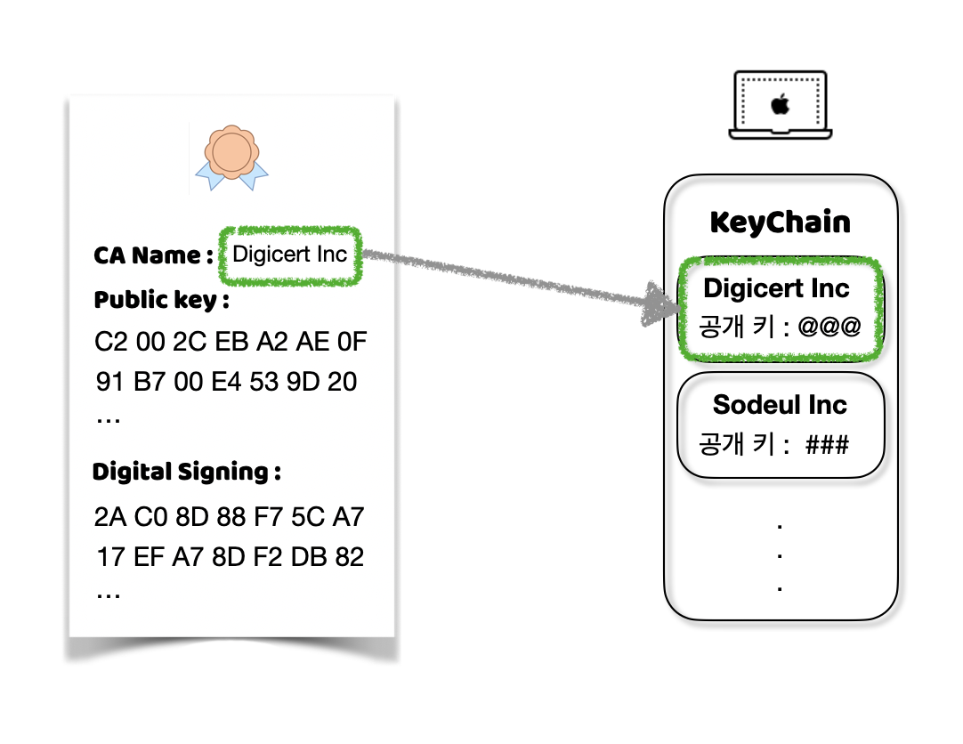 이 인증서가 자신이 가진 CA 리스트에 있는 기관에서 발급받은 것인지 확인합니다.
