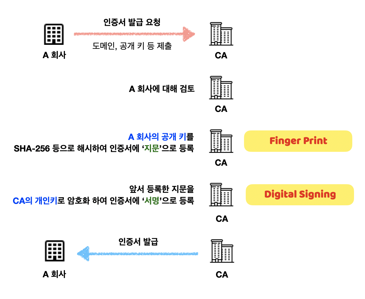 그러면 CA는 검증을 걸친 후 발급 받고자 하는 기관의 공개 키를 해시(SHA-256 등) 합니다.