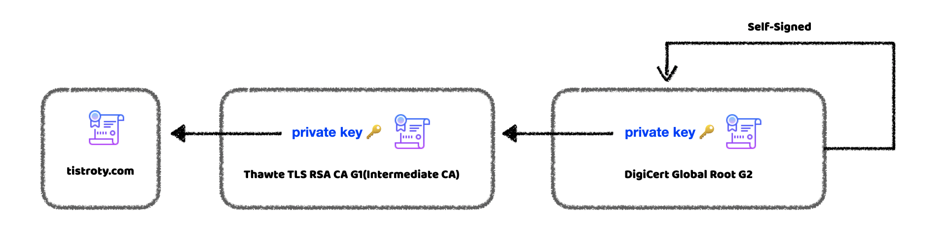 보통 3단계에 걸쳐서 인증서 체인이 일어나는데,