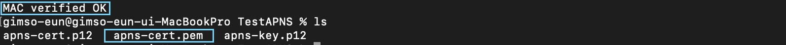 MAC verified OK 가 뜨면서 apns-cert.pem 이란 파일이 생겼으면