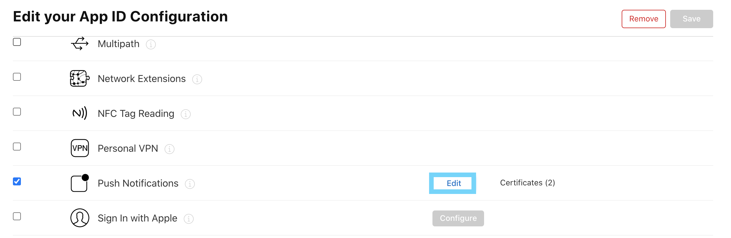 Push Notifications 항목에서 Edit 버튼을 눌러 주셈