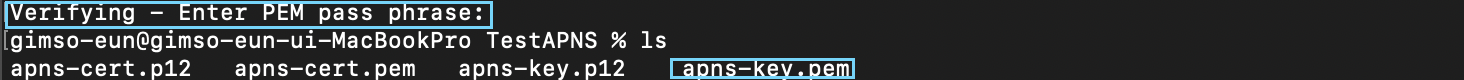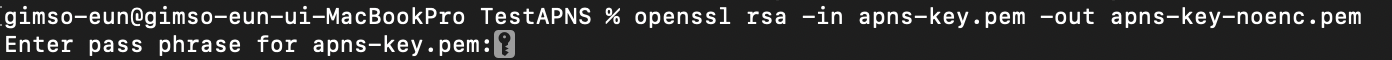 여기서 apns-test-enc.pem은 자기가 설정하고 싶은 이름으로 하면 됨!!!!!!!!!