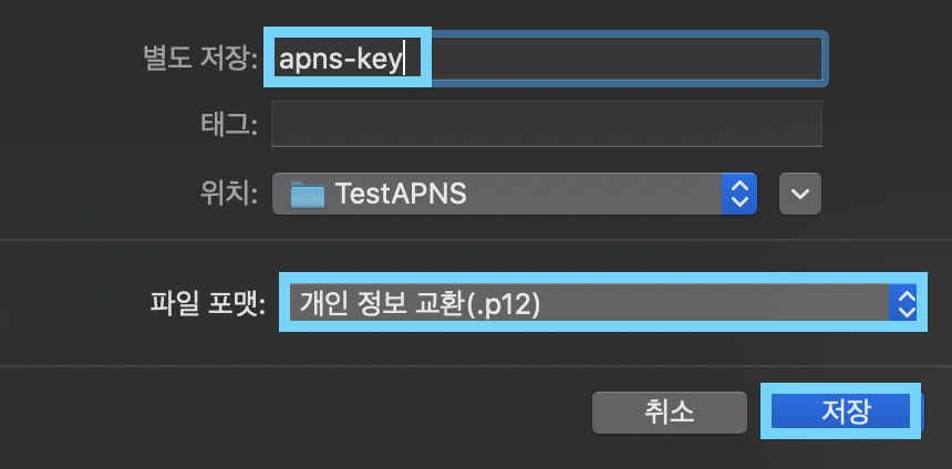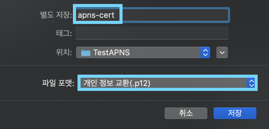 또한 파일 포맷이 개인 정보 교환(.p12) 인지 확인하고 저장 해주셈