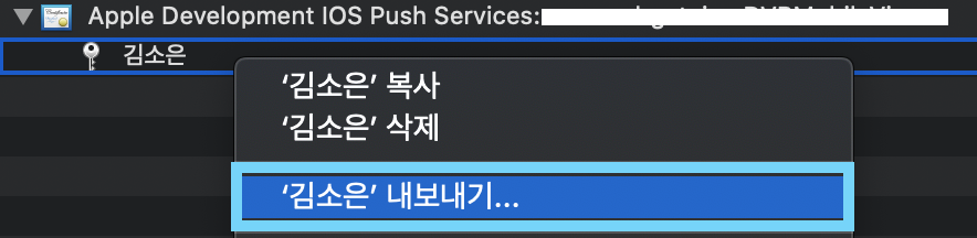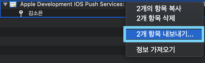 이 p12 파일을 생성하기 위해선 아까 키체인에 등록했던 인증서와 키가 필요함