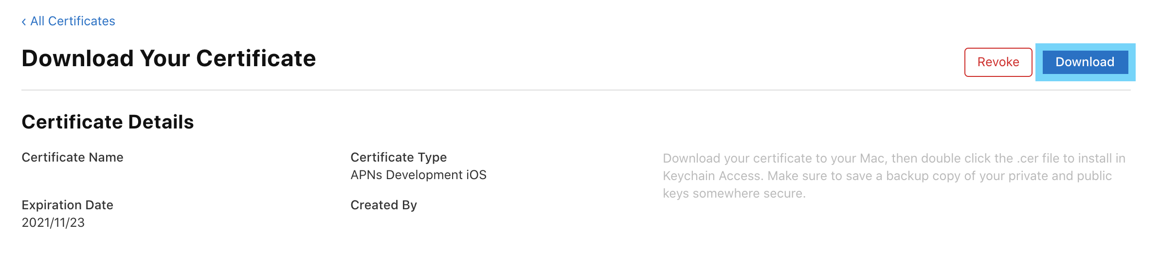 그러면 이렇게 개발용 APNs가 생성되고, Download 할 수 있게 됨!!!