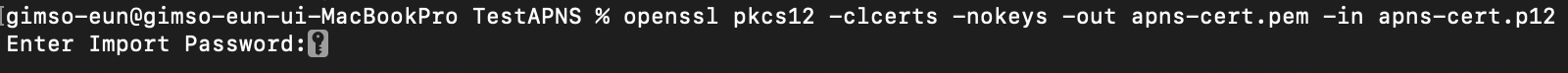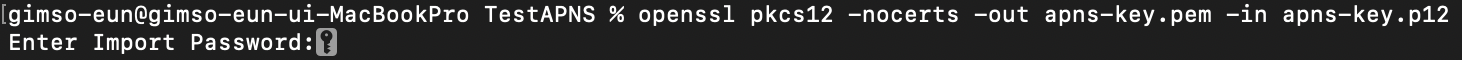 또 비밀번호 치라고 나오고, apns-key.12 만들 때 사용했던 비밀번호