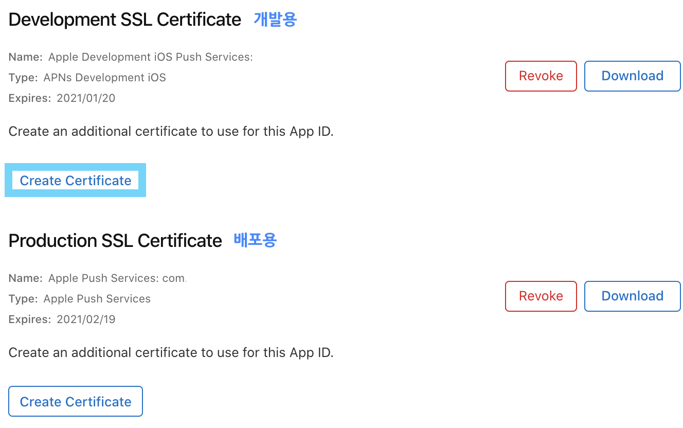 나는 개발용으로 먼저 만들어보겠음 Create Certificate 클릭해주셈