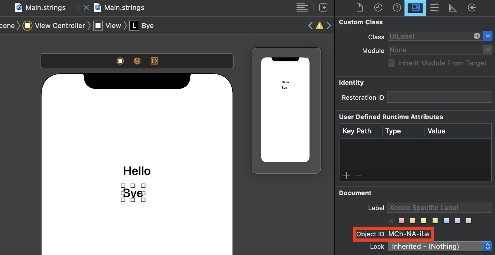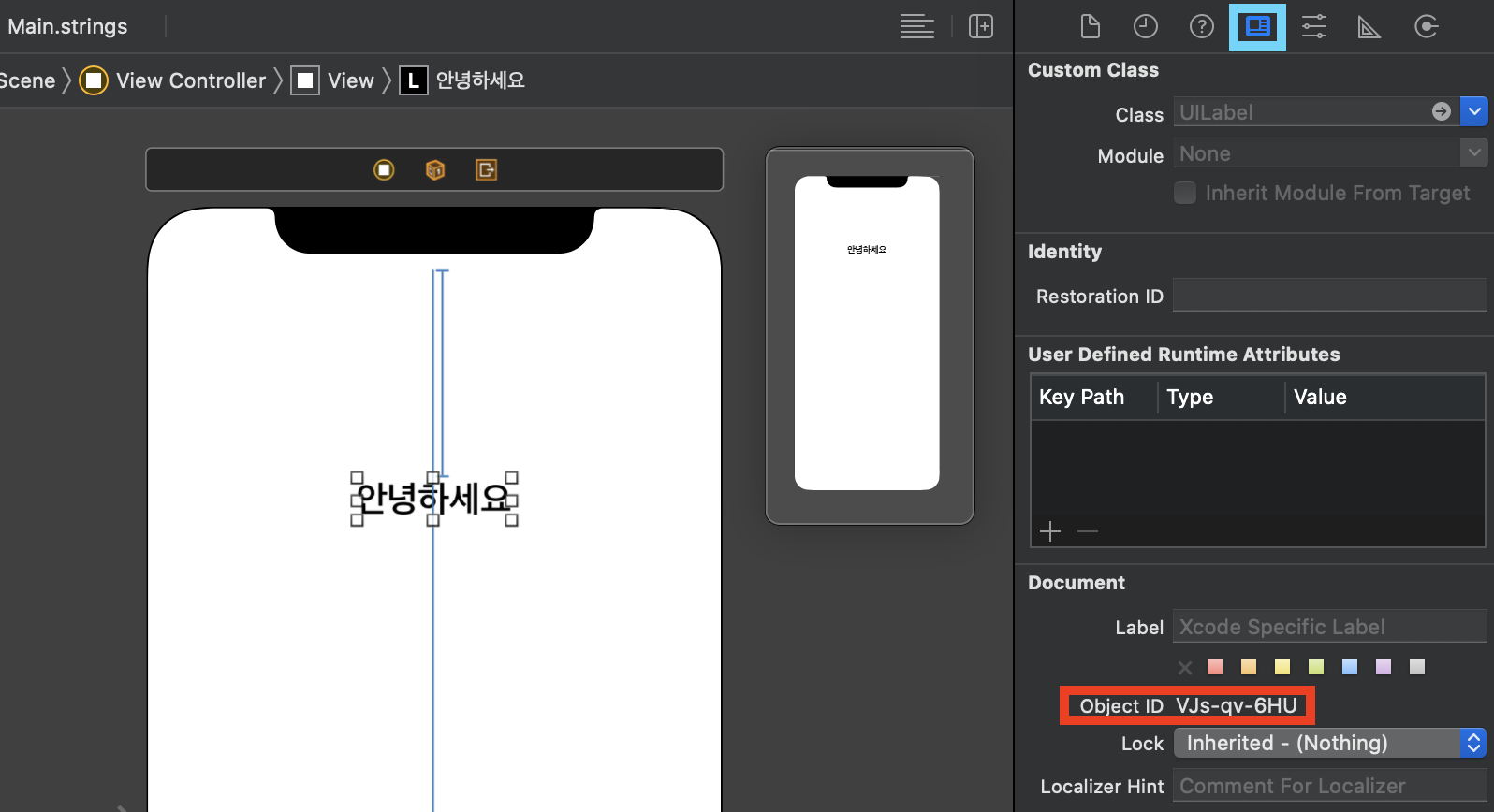 이 Label의 text를 Localizable을 이용해 아까 만들어둔 key "Hello"를 적용시켜 보겠음