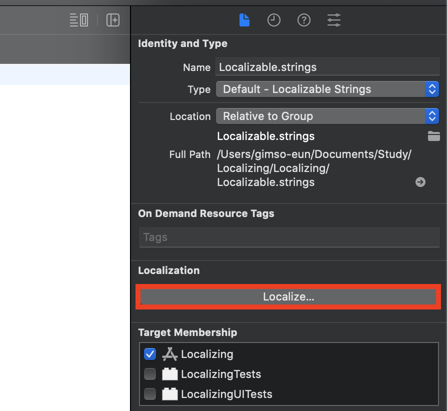 그럼 Localizable.strings의 인스펙터 영역을 보면