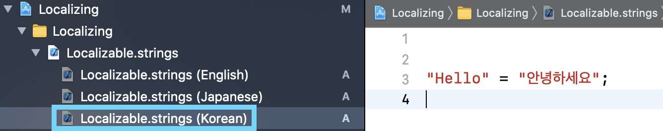 그리고 다시 Localizable.string 파일로 돌아가면