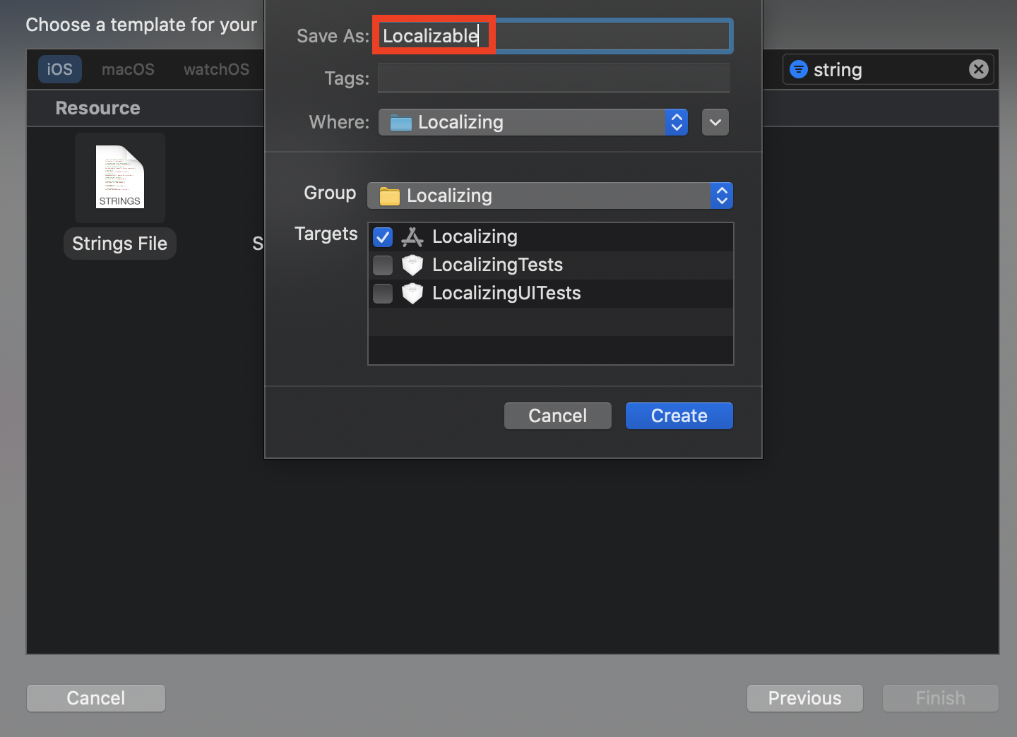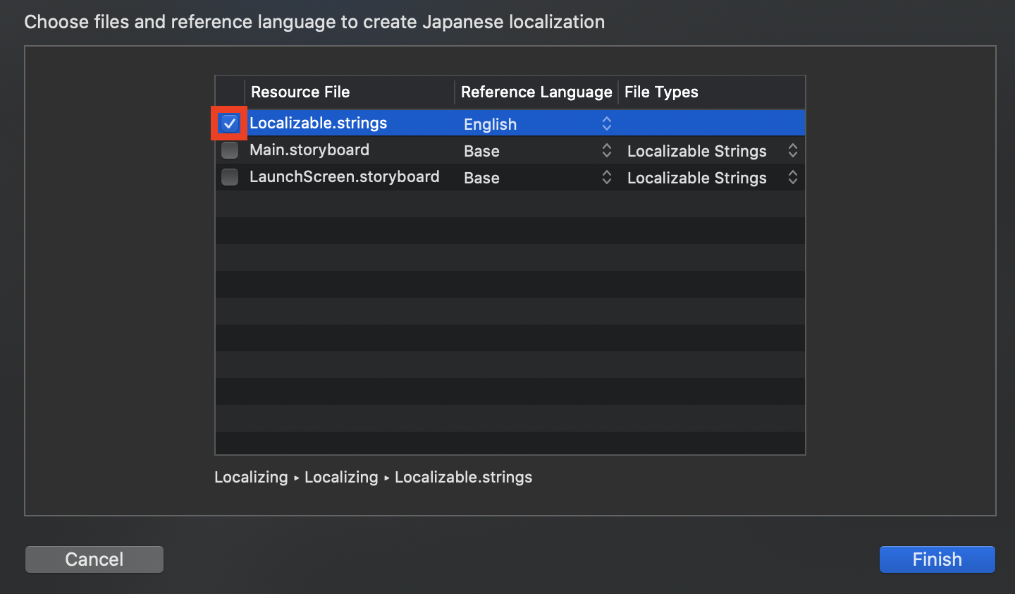Localizable.strings만 체크하고 Finish를 해줍세 ㅎㅎ
