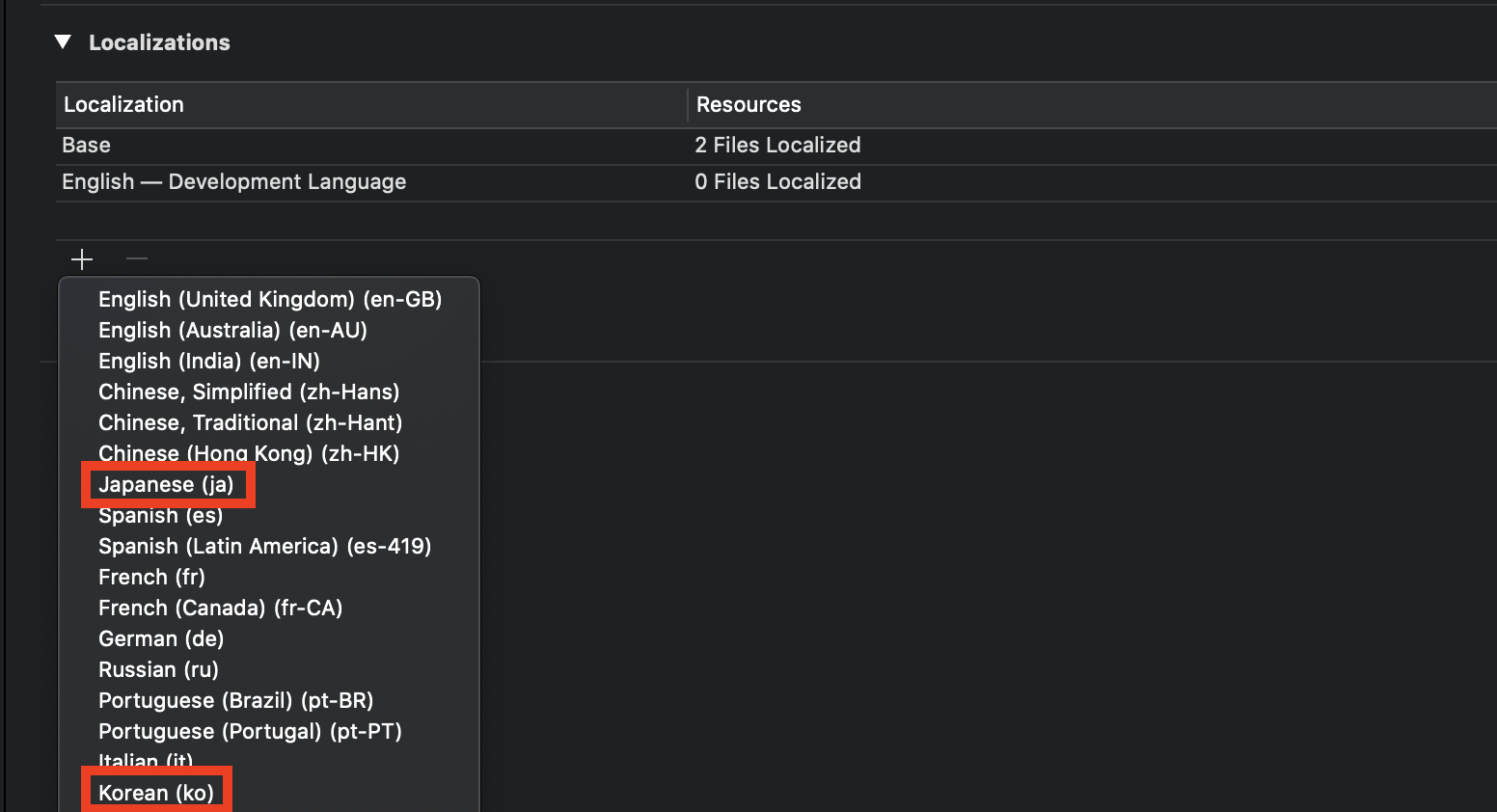 Storyboard 때와 같이 Project -> Info -> Localizations에서 + 버튼을 누르고