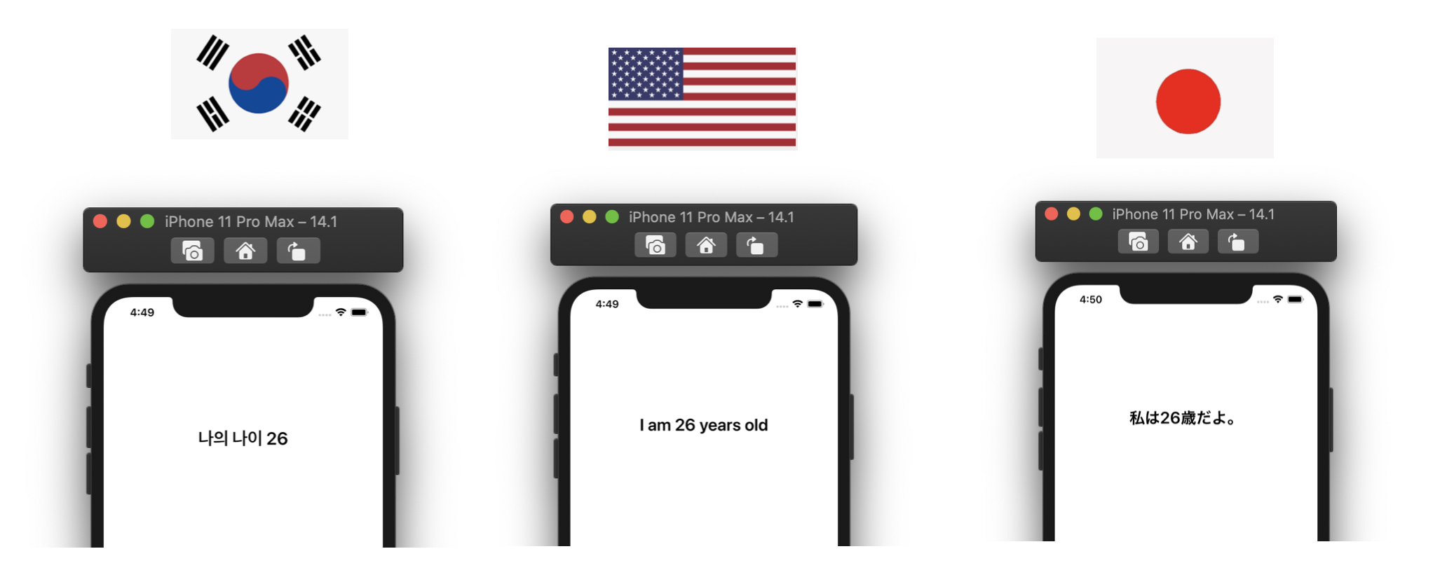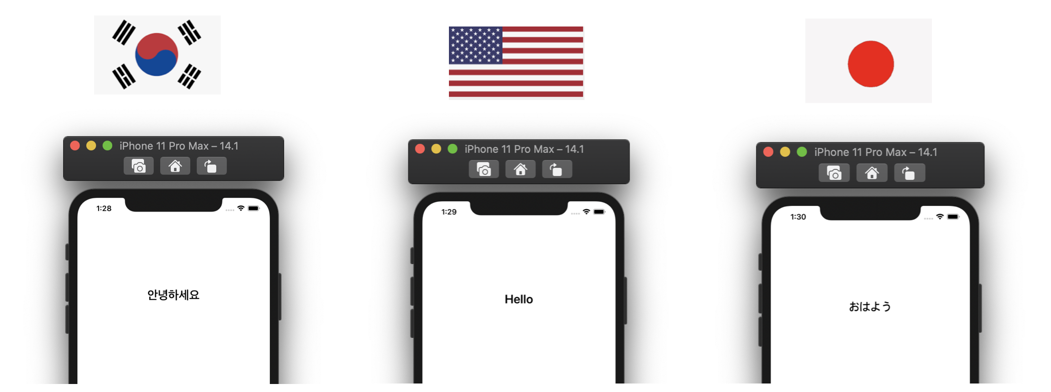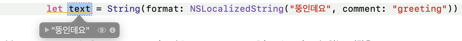 이렇게 사용하면 우리가 Localizable에 정의한 "Hello"란 key의 value 중에서