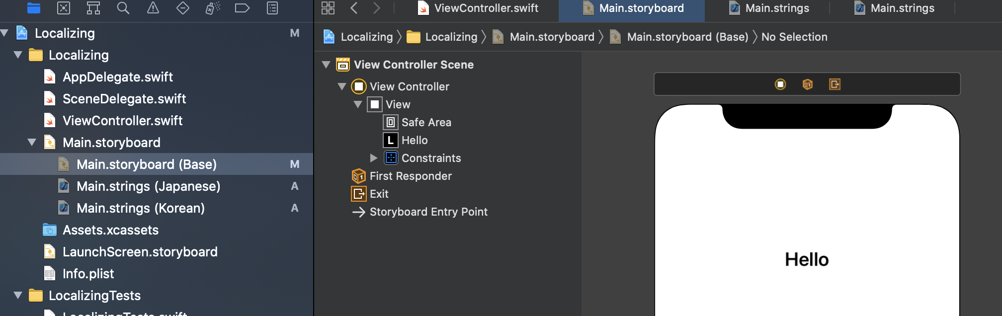 이렇게 Storyboard에서 작성한 Hello는 Base로 "영어" 처리되고,