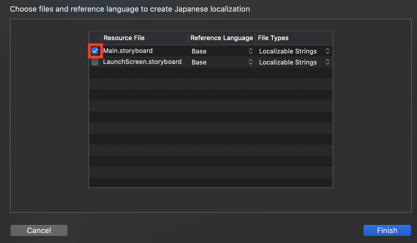 다국어를 처리하고 싶은 Storyboard를 클릭한 후 Finish를 눌러주면 추가됨
