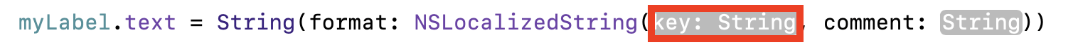 myLabel.text = String(format: NSLocalizedString("Hello", comment: "greeting"))