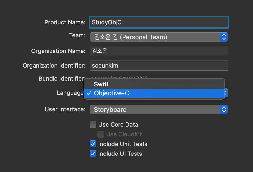 언어 선택을 Swift가 아닌 Objective-C로 해주셔야 함