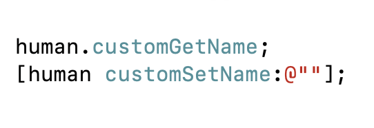 @property (getter=customGetName, setter=customSetName:) NSString *name;